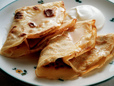 Bata no liquidificador os ingredientes da massa até que fique homogêneo. Despeje meia concha de massa na frigideira e espalhe até cobrir todo o fundo. Cozinhe até que a parte de baixo da massa fique dourada. Vire-a e deixe dourar também. Faça o mesmo com o restante da massa. Por fim, coloque o recheio de sua preferência na massa, dobre a panqueca e polvilhe o açúcar.